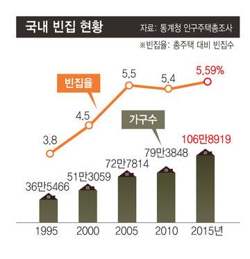 빈집은 ‘공가’나 ‘폐가’로도 불린다. 비게 된 원인, 건물의 용도와 유형, 비어 있던 기간, 파손 정도 등에 따라 의미가 다르다. 국내 빈집 현황은 통계청이 5년마다 시행하는 인구주택총조사를 통해 확인된다. 조사 시점에 훼손도가 50% 미만인, 사람이 살지 않은 집을 모두 셈한다. 1995년 36만5466가구였던 국내 빈집은 2000년 51만3059가구, 2005년 72만7814가구, 2010년 79만3848가구에서 2015년 106만8919가구로 늘었다. 전체 주택 대비 빈집 수를 따진 빈집률도 같은 기간 3.8%, 4.5%, 5.5%, 5.4%, 5.6%로 늘었다. 뚜렷한 증가 추세다.