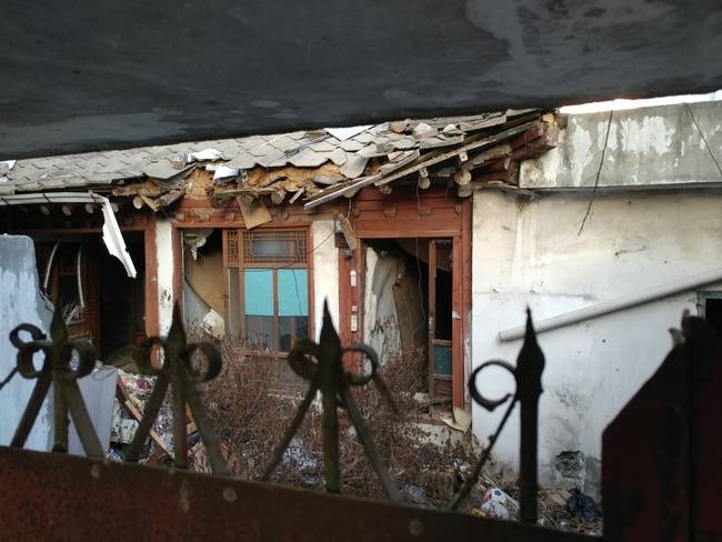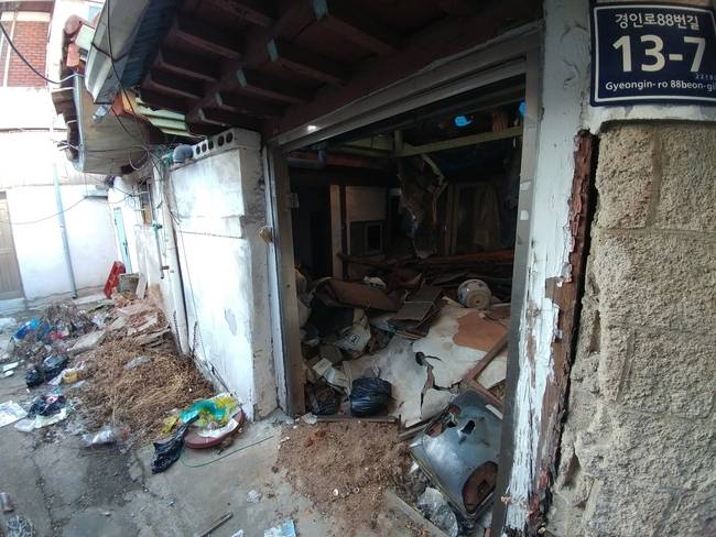 맞은편 1층 집은 마당이 어지러웠다. 붉은색 고무대야, 플라스틱 바구니, 고무호스, 검은 비닐봉지, 깨진 형광등, 부서진 가구가 파리한 나뭇가지와 함께 널렸다. 담벼락 일부는 불에 그슬렸고, 잠긴 대문 건너 창문 안으로 곰팡이가 시커멓게 장악한 벽지가 눈에 들어왔다.