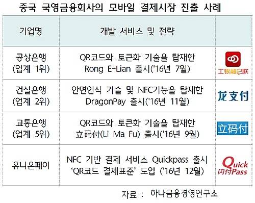 국영 은행들도 자체 모바일 결제 플랫폼을 개발해 알리바바와 텐센트에 맞서고 있다. 은행업계 1위인 공상은행은 지난해 7월 QR코드와 토큰화 기술을 탑재한 롱이리엔(融e联)을 출시했다. 이어 그해 9월엔 교통은행도 공상은행과 유사한 기술 기반의 6리마푸(立码付)를 내놨다. 또 같은 해 11월에 건설은행은 안면 인식 및 NFC 기능을 탑재한 드래곤페이 서비스를 선보였다.
