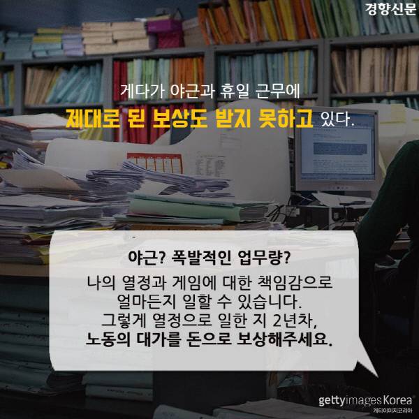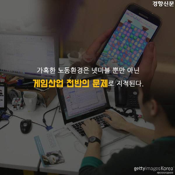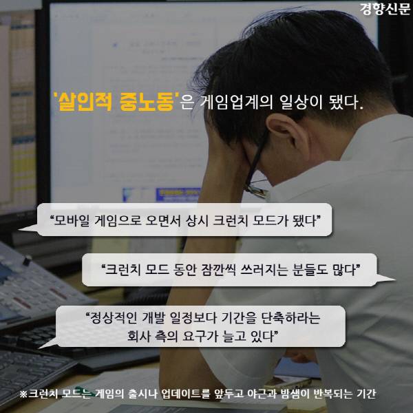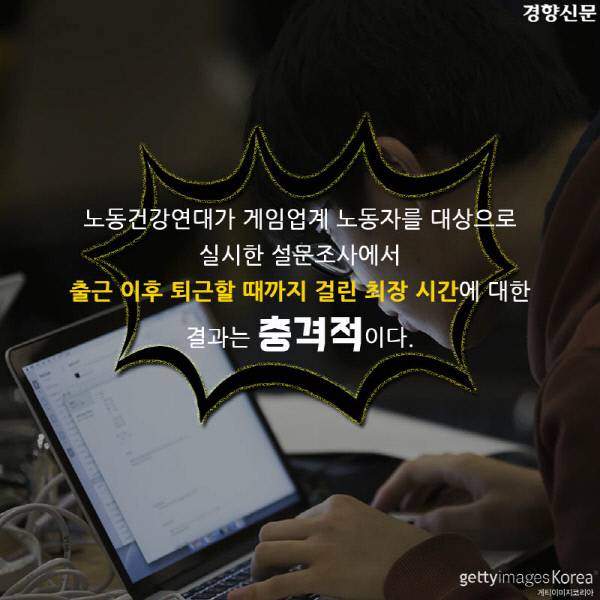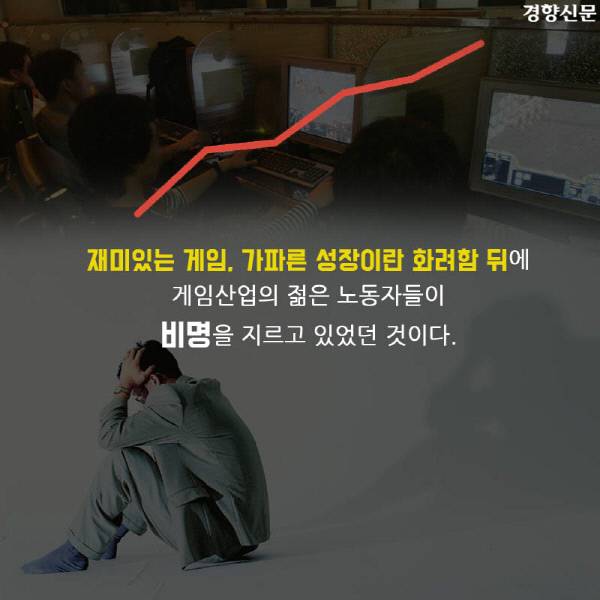 [경향신문] 이 카드뉴스는 경향신문 ▶[게임산업 노동자 잔혹사](1)“밤 10시 퇴근은 반차, 12시가 칼퇴, 새벽 2시 넘어야 잔업” 기사를 바탕으로 재구성했습니다.