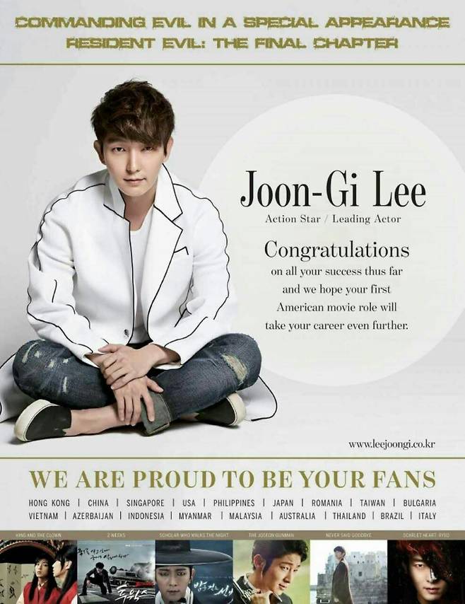 이준기의 해외 팬들은 최근 할리우드 리포트에 광고를 넣었다. 영화 '레지던트 이블'에서 커맨더 리 역할로 활약한 그를 위한 깜짝 선물이었던 것.