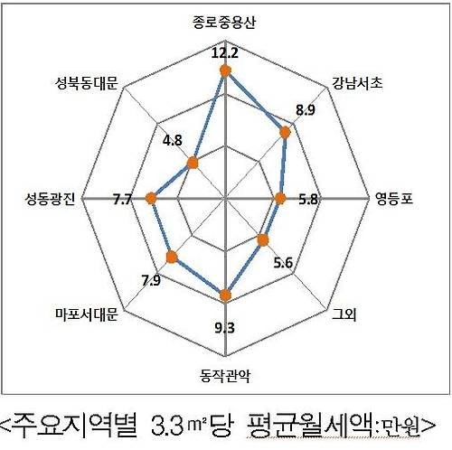 가장 월세가 싼 곳은 성북·동대문 지역으로 3.3㎡당 4만8천원이었다. 동작·관악 지역의 절반도 안되는 셈이다.