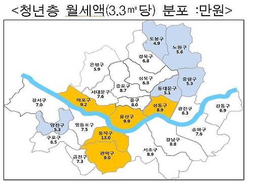 청년층 월세 계약만 추려 따져봤더니 3.3㎡당 월세가 가장 비싼 자치구는 노량진이 속한 동작구로, 13만원에 달했다.