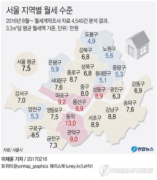 서울시는 지난해 8월 시작한 '월세계약조사' 자료 4천540건을 분석한 결과 동작·관악 지역의 3.3㎡당 평균 월세액이 9만3천원으로 종로·중·용산 지역 3.3㎡당 12만2천원에 이어 두번째로 비쌌다고 16일 밝혔다.