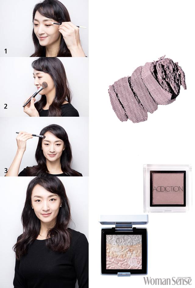 1 밝은 브라운 컬러 섀도를 눈덩이 전체에 펴 바른 뒤 아이라이너 대신 눈가 라인에 섀도를 살짝 번지게 펴 바른다.