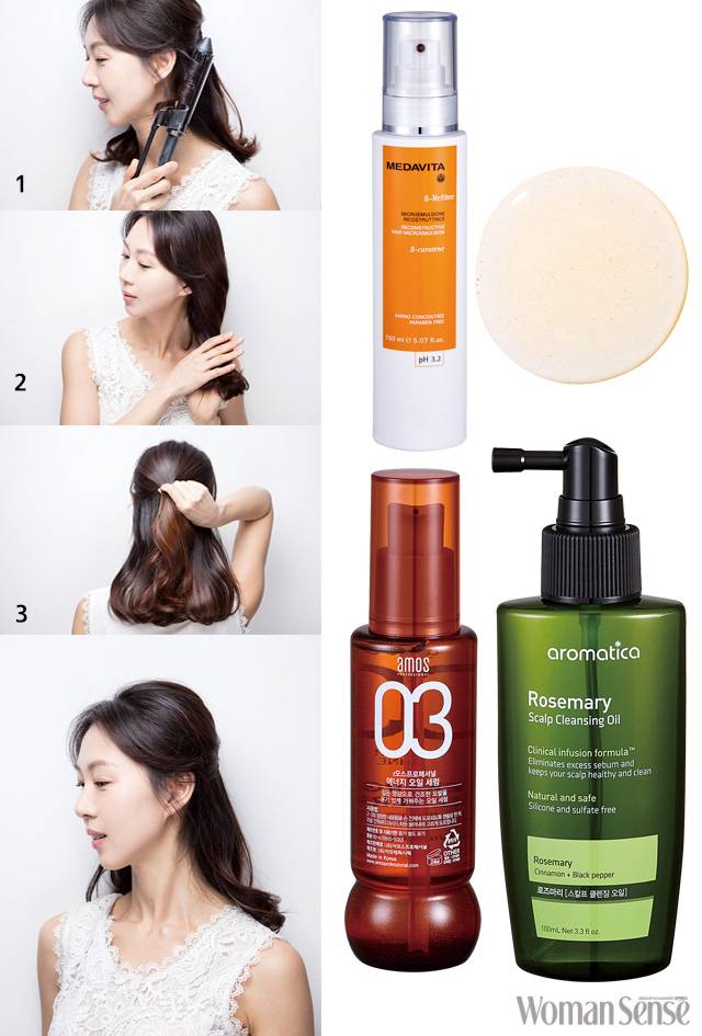 2 에센스나 오일로 손상된 모발에 영양을 공급해 윤기 있는 모발로 연출한다.