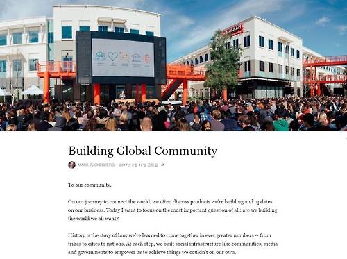페이스북이 가족과 친구들을 연결하는 것을 넘어 전 세계를 글로벌 공동체로 엮는 사회적 기반 건설에 나서겠다고 마크 저커버그 페이스북 최고경영자(CEO)가 17일 선언했다.