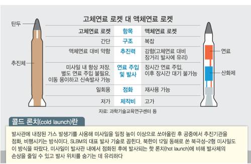문제는 북한의 SLBM 북극성과 지상발사 중장거리미사일 북극성-2형이다. 지난해 8월 발사된 북극성과 지난 12일 평북 방현 일대에서 시험발사된 북극성-2형은 고체연료를 사용한다. 북한의 로켓 엔진 라인업을 구성하는 스커드와 무수단 계열은 모두 액체연료를 쓴다. 단거리 미사일인 KN-02나 우주발사체인 은하-3호의 3단 추진체 등에서 고체연료를 사용하지만 최대 2000㎞ 이상 날아갈 수 있는 잠재력을 가진 SLBM에 고체연료를 탑재하는 것은 다른 차원이다.