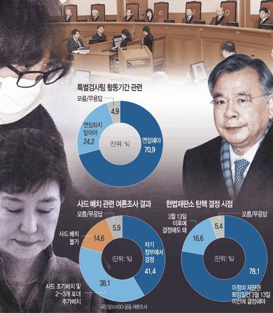 우리 국민 10명 중 7명은 박영수 특별검사팀의 활동 기간이 연장돼야 한다는 의견을 갖고 있는 것으로 나타났다. 또 박근혜 대통령 탄핵심판 결정 시점과 관련해 헌법재판소가 이정미 헌재소장 권한대행(재판관)의 임기 만료일인 ‘3월 13일 이전에 결정해야 한다’는 답변이 78.1%를 기록하며 압도적으로 높았다.