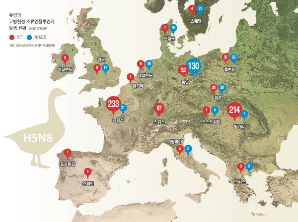 가까운 일본의 경우 한국보다 가금의 발생 건수는 훨씬 적지만 야생조류의 발생은 더 많은 것으로 집계됐다. 일본 환경성에 따르면 야생조류의 경우 15일 현재 21개 도·현에서 212건의 감염 사례가 확인됐다. 반면 가금의 경우는 7개 도·현에서 10건의 양성 사례만 발생했을 뿐이다. 반면 한국의 경우 야생조류보다 농장 가금에서의 발생 건수가 압도적으로 많다. 농림축산식품부 집계에 따르면 지난 9일 현재 야생조류에서의 AI 발생 건수는 53건으로 폐사체와 살아있는 개체에서 36건, 분변에서 17건 확인됐다. 가금의 경우 10개 광역시·도, 41개 시·군의 340개 농장에서 주로 산란계와 육용오리가 AI에 감염된 것으로 나타났다. 한국 정부가 AI 전파의 주범으로 꼽는 야생조류의 감염 건수가 일본이 더 많고, 지역도 광범위한 것을 고려하면 한국의 AI 대발생은 인재임을 알 수 있다. 살처분 수는 한국이 지난 10일 현재 3312만마리인 데 비해 일본은 지난달 15일 기준 114만마리 정도다. 독일, 스위스, 덴마크, 프랑스 등에서도 다수의 야생조류와 가금에서 AI 감염 사실이 확인됐지만 한국 같은 대학살이 벌어진 경우는 없고 전문가들은 지적한다.