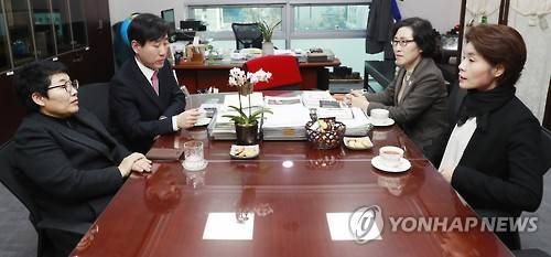 (서울=연합뉴스) 한종찬 기자 = 여야 4당의 국회 정상화 합의에 따라 국회 상임위원회가 정상 가동된 20일 오후 국회 의원회관에서 환노위 여야 간사가 만나 MBC 노조 탄압 등 3개 청문회의 대상과 시기, 방법 등을 논의하고 있다. 왼쪽부터 자유한국당 임이자, 바른정당 하태경, 국민의당 김삼화, 더불어민주당 한정애 의원. 2017.2.20