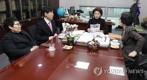 (서울=연합뉴스) 한종찬 기자 = 여야 4당의 국회 정상화 합의에 따라 국회 상임위원회가 정상 가동된 20일 오후 국회 의원회관에서 환노위 여야 간사가 만나 MBC 노조 탄압 등 3개 청문회의 대상과 시기, 방법 등을 논의하고 있다. 왼쪽부터 자유한국당 임이자, 바른정당 하태경, 더불어민주당 한정애, 국민의당 김삼화 의원. 2017.2.20
