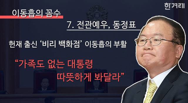 이동흡 변호사의 대리인단 합류는 극적입니다. 2013년 박 대통령이 대통령직 인수위원회 대변인으로 윤창중씨를 낙점한 데 이어, 헌재소장 후보로 이동흡 전 헌법재판관을 지명하자 법조인들은 ‘멘붕’에 빠졌습니다. “헌재의 윤창중” “윤창중·이동흡을 쪽집게 고르듯 골라내는 솜씨는 MB보다 몇 단계 위”라는 비아냥까지 나왔습니다. 극우보수에 치우친 성향 우려 뿐 아니라, 헌재 내부에서 반대 연판장이 돌 정도로 인망이 없고 비리 의혹이 많은 인물이라는 점 때문입니다. 역시나 청문회에선 위장 전입, 업무추진비 부당 사용, 기업체 협찬강요, 부부 동반 관광성 외유, 입원료 보험사 떠넘기기 등의 의혹이 줄줄이 쏟아져 ‘비리 백화점’이란 별명도 얻었습니다. “청문회 할 것도 없다”는 말까지 들으며 결국 자진 사퇴했던 그가, 헌재 심판정에 대통령 대리인단으로 나타난 겁니다.