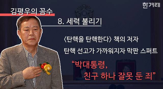최종변론(2월24일)을 불과 일주일 앞둔 2월16일, 김평우 전 변협회장도 대리인단에 이름을 올렸습니다. 김 변호사는 2월13일 <탄핵을 탄핵한다>라는 책을 냈는데, 서석구 변호사가 앞서 재판정에 들고 온 바로 그 책입니다. 서문엔 “친구 하나 잘못 두신 죄로 그 깨끗한 이름을 잃으시고 탄핵소추까지 당하는 수모를 겪었으나 끝까지 의연하게 대통령의 품위를 잃지 않고 대한민국의 헌법을 수호하신 박근혜 대통령께 깊은 존경과 사랑을 드린다”고 적혀 있습니다.