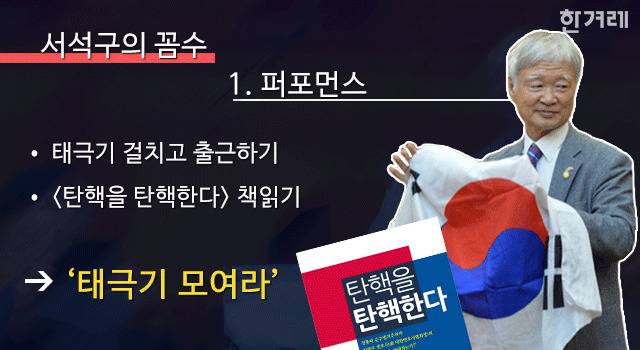 2월14일(13차 변론기일) 헌법재판소에서 돌연 가방에 넣어 온 태극기를 꺼내 들어 불필요한 물품을 반입해선 안 된다는 제지를 받았지만, 서 변호사는 방청석을 향해 태극기를 펼쳐들며 시위했습니다. 2월16일(14차 변론기일)에도 태극기를 두른 채 기자들 앞에 등장했죠. 법정에서 <탄핵을 탄핵한다>는 김평우 변호사의 책을 일부러 읽는 듯 하며 표지가 보이게 내려놓기도 했습니다.