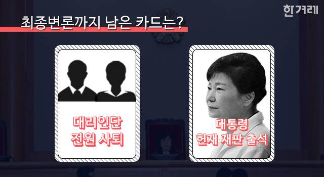 대리인단은 1월25일 ‘대리인단 전원 사퇴’를 언급한 이후 계속 사퇴 카드를 만지작거려 왔습니다. 새로 대리인단을 선임한 뒤 기록을 검토해야 한다며 시간을 끌려는 것이죠. ‘대통령 출석’ 카드도 마찬가지입니다. 박 대통령이 출석 의사를 밝힐 경우 추가 기일을 잡는다는 명목으로 다시 지연 전략을 펼 수 있으니까요. 대리인단은 16일 재판 뒤 브리핑에서 “변론 종결 시점이 정해졌으니 대통령 출석과 관련해 논의해봐야 할 것 같다”고 말했습니다.