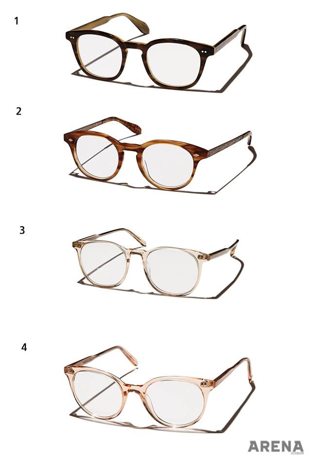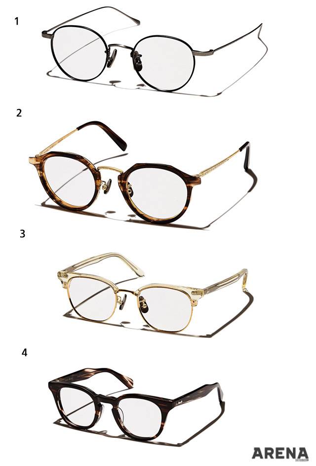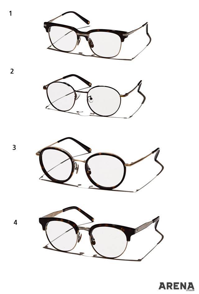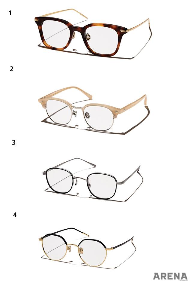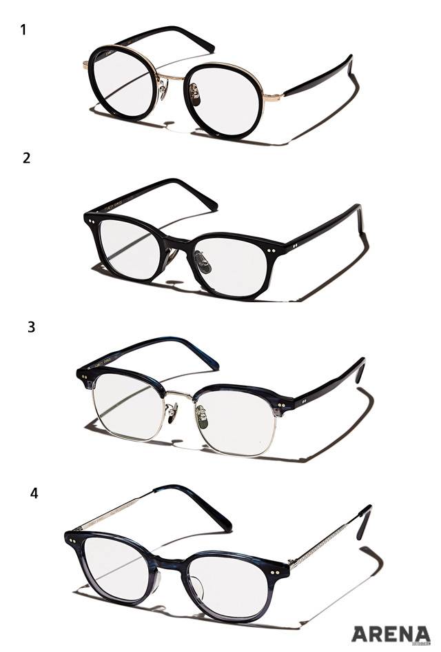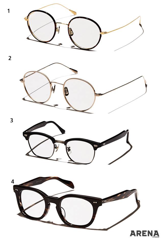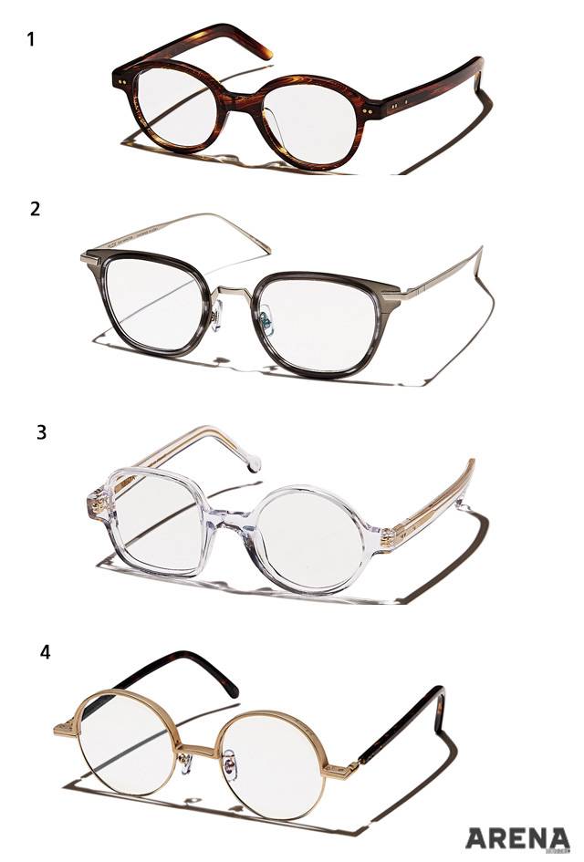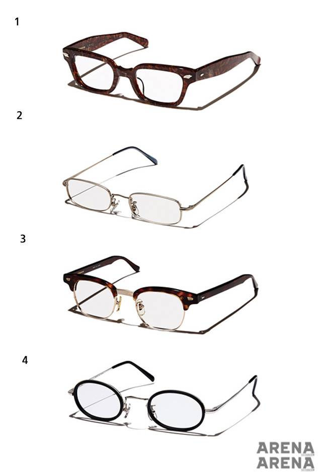1 잔잔한 패턴의 금색 메탈 프레임을 두른 콤비네이션 안경 36만원. 2 하단부를 다각형으로 처리한 셀룰로이드 소재의 뿔테 안경 39만원.3 반투명한 감색 하금테 안경 42만원.4 템플에 패턴을 가미해 빈티지한 분위기가 나는 라운드 스퀘어 뿔테 안경 36만원.