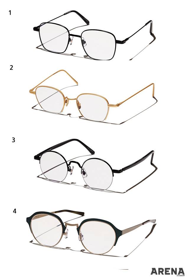1 지적인 분위기를 자아내는 검은색 티타늄 안경 19만5천원. 2 하단부 프레임을 생략하고 낚싯줄로 렌즈를 받친 독특한 발상의 금테 안경 21만5천원. 3 정직한 원형의 메탈 반무테 안경 22만원.4 납작한 투톤 메탈 프레임 안경 19만5천원.
