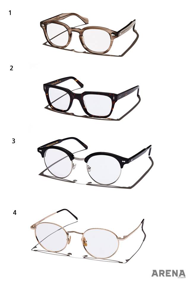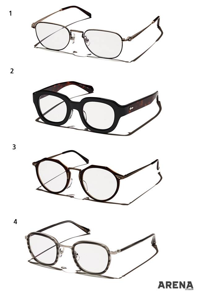 1 템플부터 프레임까지 유연하게 흐르는 디자인의 커피색 뿔테 안경 22만원. 2 메탈과 아세테이트를 겹친 회색 안경 23만5천원. 3 좌우 디자인을 달리한 투명 뿔테 안경 24만5천원. 4 프레임의 상·하부 두께에 차이를 준 티타늄 소재 금테 안경 23만5천원.