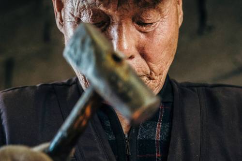 <<사진 = 기계가 사람의 노동을 대신한다 해도 결국 질 좋은 도구를 제작하는 것은 뛰어난 장인의 수공(手工)으로만 가능하다. 얼굴에 맺힌 주름은 수만 번 쇠메를 내리친 순간의 합이다.>>