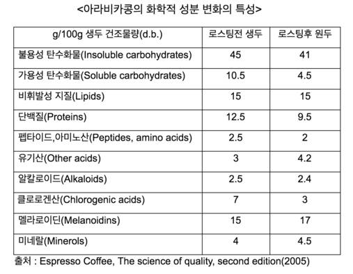 커피생콩에는 탄수화물과 단백질, 지질, 유기산, 클로로겐산, 미네랄 등의 여러가지 성분이 있는데 이러한 성분들은 로스팅하면서 많이 소실되거나 다른 성분으로 변화한다. 아래의 표는 아라비카콩을 로스팅 하기 전과 후의 성분 변화를 나타낸 것이다.