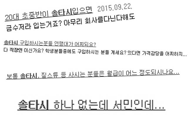 이처럼 높은 가격대임에도 마니아를 자처하는 이들이 많아 솔타시 관련 게시글에는 "보통 솔타시 사시는 분들은 월급이 어느 정도 되시나요?" "저는 솔타시 하나 없는 서민인데…" 처럼 옷 자체보다 솔타시를 구매하는 사람들에 대해 호기심을 갖는 이들도 많다.