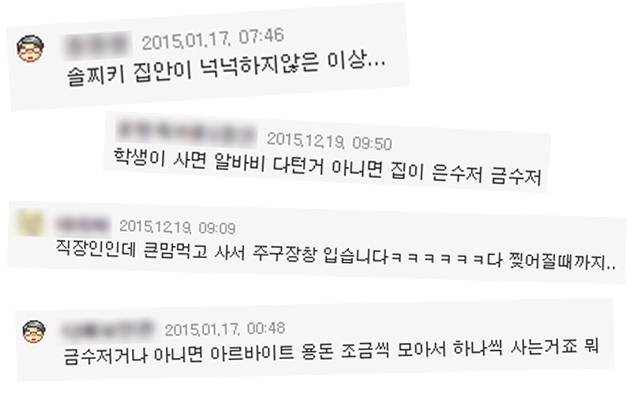 답변에는 항상 "금수저 아니면 아르바이트 조금씩 모아서 하나씩 사는 거죠. 뭐" "솔직히 집안이 넉넉하지 않은 이상…" "일시불로 살 정도면 금수저가 맞죠" 등 유독 금수저, 은수저 등을 논하는 얘기가 빠지지 않고 등장한다.