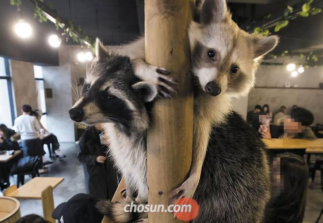24일 오후 서울 마포구에 있는 야생동물 카페. 국내에서는 희귀한 '미국 너구리' 라쿤 6마리를 키우는 곳이다.