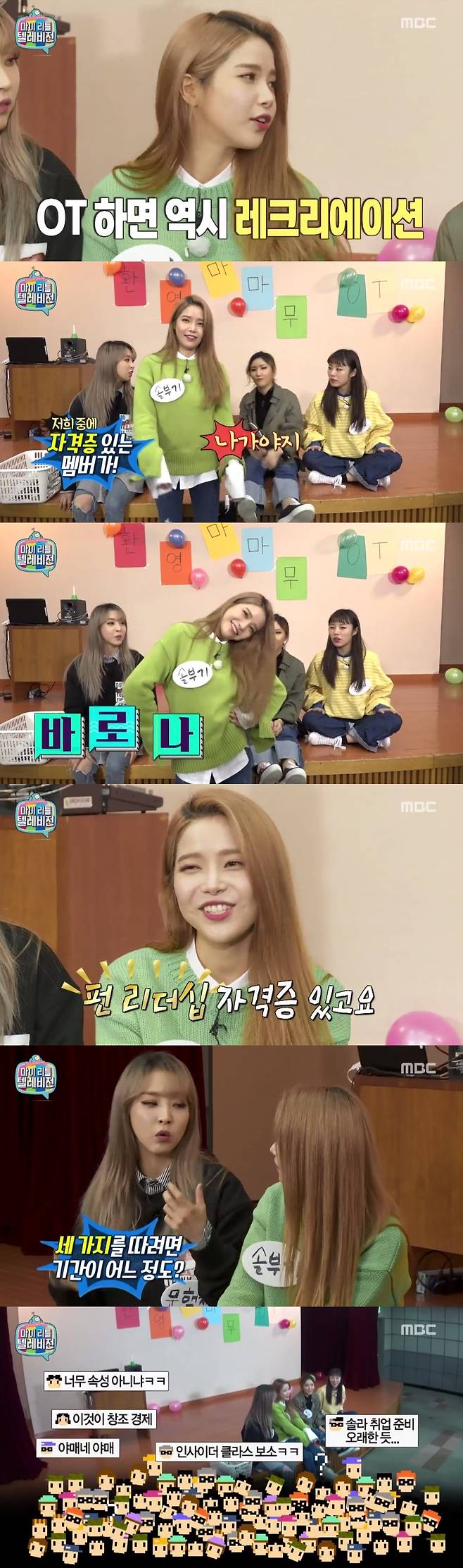 이날 솔라는 "OT에서는 레크레이션이 빠질 수 없다"라며 말했고, 문별은 "자격증 있는 멤버가 있다"라며 언급했다.