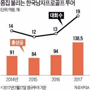 국내 남자 프로골프 정규투어는 카이도 시리즈 신설로 연간 총상금 규모가 138억5000만원으로 불어났다. 2011년 132억원을 넘어서는 사상 최대 규모다. 대회 수도 2008년(20개)에 이어 역대 두 번째로 많다.