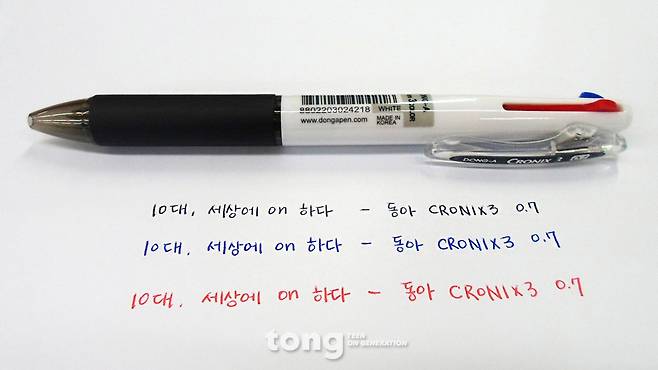 화려한 노트 필기 실력을 자랑하는 학생 중에는 한 펜에 여러 가지 색상이 포함된 ‘멀티펜’을 선호하는 경우가 많다. 멀티펜 역시 일본 제품이 인기다. 하지만 펜의 바디와 펜심의 가격이 꽤 높다는 점은 학생들에게 부담이 되기도 한다. 그렇다면 국산 제품 중 가성비가 가장 좋은 멀티펜은 어떤 것일까. 국산 제품 중에서도 좋은 제품들이 많지만 그 중에서도 ‘동아 CRONIX3 0.7’을 추천한다. 판매자의 적극 추천으로 써 본 이 펜은 이미 펜 덕후들 사이에서 가성비가 좋다는 평을 듣고 있다고 한다. 이전에는 잉크가 가끔 새는 단점도 가지고 있었으나, 최근에 리뉴얼이 된 후로는 잉크가 새는 단점은 사라졌다고 한다. 가장 좋은 점은 펜을 사용해 보았을 때, 잉크가 뭉치거나 끊어짐이 전혀 없다는 점이다. 하지만 펜심을 따로 팔지 않는다는 건 단점이다. 펜의 가격은 3000원으로 외산 멀티펜에 비해 저렴한 편이지만, 펜심을 따로 구매할 수 없어 한 가지 색상이 떨어지면 새로 사야 한다. 한 자루 값으로 세 자루를!