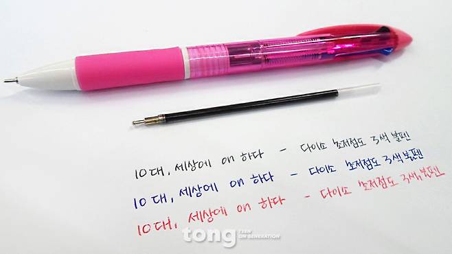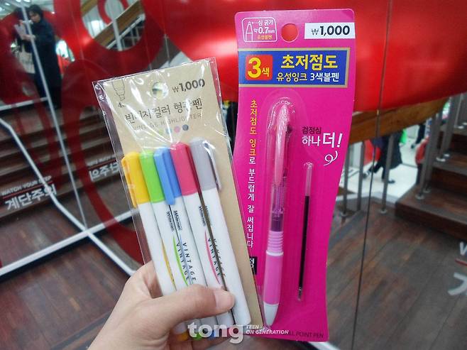저렴하지만 가성비 좋은 꿀템들이 가득 모여 있는 다이소. 펜 역시 예외가 아니다. 대부분의 펜들이 1000~1500원의 저렴한 가격을 자랑하지만, 품질만큼은 외국산에 뒤지지 않는 것들이 있다. 다이소에서 구매한 다양한 펜들은 가격에 비해 품질이 뛰어난 편이지만, 그 중에서도 가장 좋은 가성비를 자랑하는 ‘꿀템’ 두 가지를 선정해보았다. 바로 ‘빈티지컬러 형광펜’과 ‘초저점도 3색 볼펜’이다. 두 제품 모두 가격은 1000원으로 매우 저렴하지만, 가격에 비해 좋은 품질을 자랑한다. 특히 빈티지 컬러 형광펜의 경우, 5자루로 구성되어 있는데 5자루 모두 일반적인 형광펜과는 다른 독특한 색감을 가졌다. 잉크도 빠르게 마르는 편이어서 번짐을 막을 수 있다. 형광펜을 많이 사용하는 편이라면 색상이 많이 튀지 않아 눈에 피로감을 덜어주는 빈티지 컬러의 형광펜을 이용해보는 것도 좋다. 다음 꿀템은 ‘초저점도 3색 볼펜’이다. 이 역시 가격은 1000원으로 매우 저렴한 편이다. 심지어 검정색 리필심이 1개 포함되어 있다, 이 펜이야말로 ‘가성비 갑’이라고 자신있게 말 할 수 있다. 펜 심은 0.7mm으로 다소 두꺼운 편이지만 뭉침이 있는 것은 아니다. 부드럽게 써지는 필기감이 장점이기 때문에 빠르게 필기를 하고 싶다면 추천한다. 글=이다진 인턴기자 lee.dajin@joongang.co.kr [추천 기사] “한달에 두 개, 청소년에게 무료로 콘돔 나눠줍니다” (http://tong.joins.com/archives/35336) ▶10대가 만드는 뉴스채널 TONG 바로가기 tong.joins.com