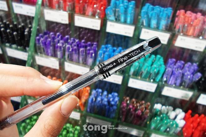 필통 속에 한 자루쯤 구비해두고픈 ‘하이테크’. 다양한 컬러와 가늘고 섬세한 펜촉으로 깔끔하게 글씨를 쓸 수 있어 학생들의 전폭적인 지지를 받고 있다. 하지만 예나 지금이나 만만치 않은 가격을 자랑한다. 큰 맘 먹고 산 하이테크를 실수로 수직으로 떨어트렸을 때의 기분이란…. 비싸고 쉽게 고장 나는 하이테크를 대신해줄 국산 펜은 ‘파인테크’다. 디자인부터 하이테크와 매우 흡사하다. 색상도 여러 가지다. 파인테크는 하이테크보다는 튼튼해 보인다. 펜촉도 하이테크보다는 약간 굵다. 파인테크의 가장 큰 장점은 가격이다. 하이테크 한 자루 가격에 파인테크 세자루를 살 수 있으니 말이다. 펜촉이 굵어 더 진하게 써지지만 그만큼 잘 번진다. 깔끔한 필기를 원하는 사람들에겐 치명적인 단점이 될 수 있다. 국산 펜 중 입소문 갑은?