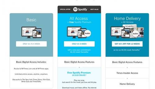 뉴욕타임스의 기본 구독 비용은 주당 3.75달러이고, 스포티파이를 이용할 수 있는 '올 액세스' 상품의 구독 비용은 주당 5달러다.