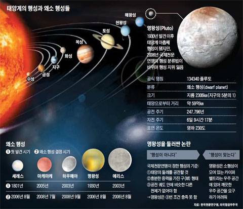 명왕성은 1930년 미국의 아마추어 천문가가 발견했다. 태양계(界) 9번째 행성이 됐지만 지구, 목성 등 기존 행성과 다른 점이 많아 처음부터 행성 자격을 두고 논란이 제기됐다. 명왕성은 지름이 2300㎞로 작은 편인 데다 질량도 달의 6분의 1 수준이다. 다른 태양계 행성에 비하면 '꼬마 천체'다. 명왕성이 가장 큰 위성인 카론과 서로 공전하는 것도 문제였다. 결정적으로 2003년 명왕성보다 큰 천체인 '에리스'가 발견되면서 "명왕성은 행성 리스트에서 퇴출 1순위"라는 말이 돌았다.