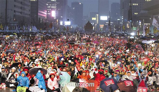 제18차 촛불 집회 본집회가 시작된 1일 오후 5시 서울 광화문광장에 LED 촛불을 든 시민들이 모였다. 오후부터 내린 가랑비 때문에 우의를 입은 참가자들은 '박근혜 탄핵 만세' '황교안 퇴진 만세' '탄핵 인용 만세'를 외쳤다. 대학생 김연희(여·24)씨는 "비가 아무리 내려도 박근혜 대통령 탄핵을 바라는 민심의 촛불은 꺼지지 않을 것"이라며 "날씨에 상관없이 촛불 집회에 계속 나올 것"이라고 말했다. 주최측인 '박근혜 대통령 퇴진 비상국민행동(퇴진행동)'은 30만명이 참석했다고 주장했다.