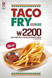 이번 신메뉴 타코 후라이는 남미 대표 메뉴인 타코의 특징을 살린 메뉴로 KFC만의 특별한 코팅 비법을 통해 씹는 식감과 맛을 자랑하는 후렌치 후라이가 매콤한 살사 소스와 어우러져 깊이 있는 풍미를 선사한다.