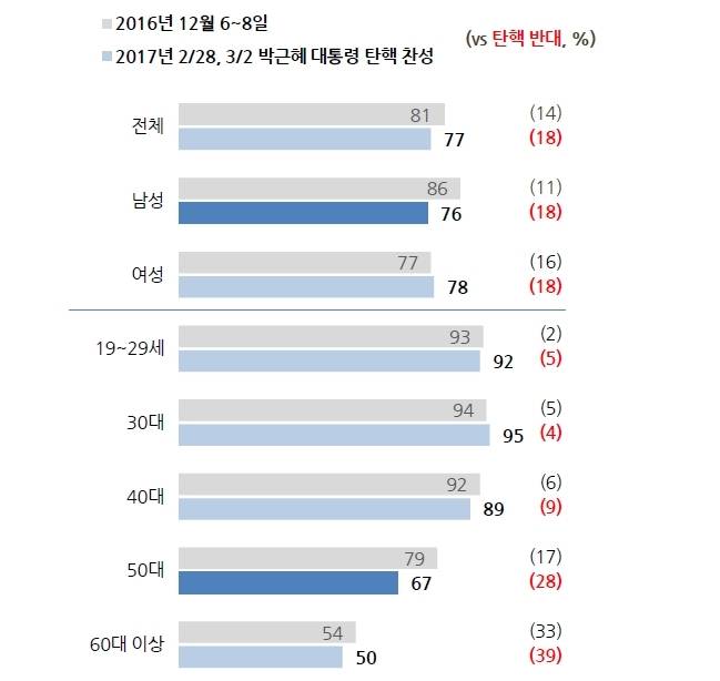 박 대통령의 정치적 근거지인 대구·경북에서도 찬성(60%)이 반대(29%)를 앞섰으며, 60대 이상에서도 찬성(50%)이 반대(39%)보다 11%포인트 많은 것으로 나타났다.