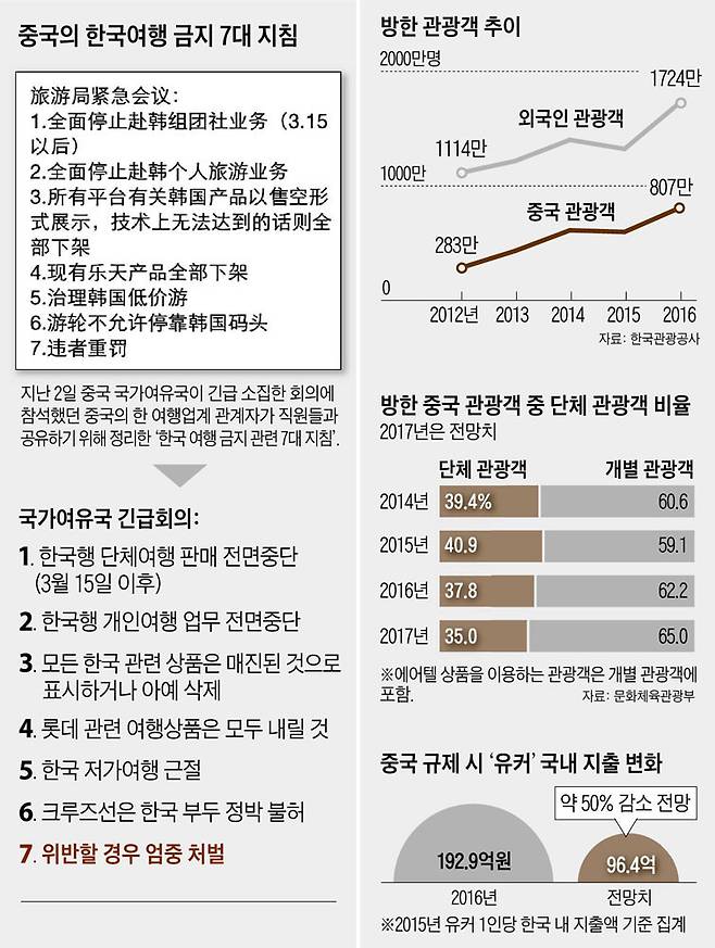 전날 국가여유국이 비공개 회의를 통해 하달한 지침이 '국가여유국 긴급회의'라는 제목으로 모바일 메신저 등을 통해 중국 여행업계 관계자들 사이에 확산됐다. 국가여유국이 '절대 문건화하지 말라'는 지침이 누설된 것이다. 실제로 이 지침에 따라 중국 1·2위 온라인 여행사인 씨트립과 투뉴를 비롯한 주요 여행사들이 이날 한국행 단체여행 상품을 일제히 인터넷 사이트에서 내렸다.