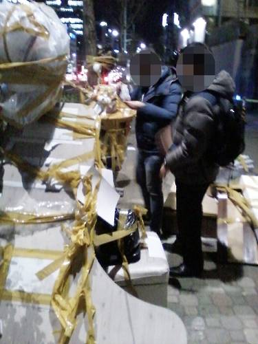 그때 웬 남성 2명이 소녀상 주변에 '소녀상 이전하라' 등 내용이 적힌 선전물을 붙인 뒤, 차에 싣고 온 폐가구를 버리거나 비닐에 싼 페트병 뭉치 등 쓰레기를 가로수와 가로등에 덕지덕지 매달았다.