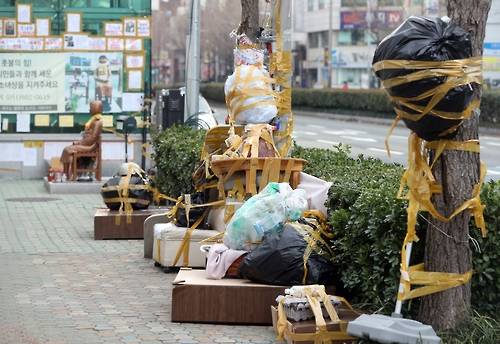 소녀상 주변이 '쓰레기장'으로 변하고 이를 둘러싼 갈등이 도를 넘고 있지만, 소녀상을 관리하겠다는 구청장 약속과 달리 부산 동구청은 관리에 뒷짐을 지고 있다.