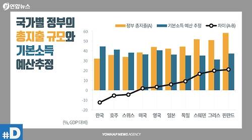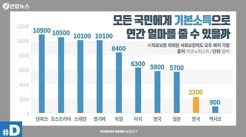 영국 경제지 이코노미스트는 우리 정부가 전국민에게 월 110만원의 기본소득을 지급하려면 국내총생산(GDP)의 23%를 더 걷어야 할 것으로 예측했다.
