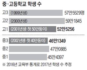 5일 교육부 통계에 따르면 올 전국의 고교 신입생 숫자는 작년(59만여명)보다 6만여명 줄었다. 공식 집계는 4월 기준이지만, 작년 중3생(52만5256명)이 전원 고교에 진학해도 작년 신입생(59만1845명)보다 6만6589명(11.3%) 줄어든다. 내년에는 46만여명으로 올해보다도 6만여명(12.2%)이 더 줄 것으로 예상된다. 신입생 수가 올해와 내년 급감하며 불과 2년 사이 59만명대에서 46만명대로 13만명(약 22%) 감소하는 것이다. 2001년생들이 초등학교에 입학한 2008년, 중학교에 진학한 2014년에도 격변이 있었다. 이들 때문에 중학교 학급당 인원 수는 30명 이하(2014년 30.5명, 2016년 27.4명)로 자연 감소했다.
