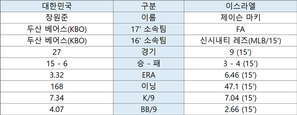 1차전에서 총력전을 펼칠 예정인 이스라엘 역시 메이저리그 경력이 화려한 제이슨 마키를 선발로 내세운다. 마키는 메이저리그 통산 377경기 124승 118패 ERA 4.61을 기록한 베테랑 투수다. 124승은 동양인 최다승을 거둔 박찬호의 통산 기록과 같다.