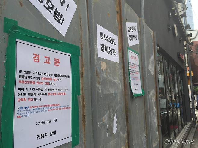 | ▲ 지난 18일 법원의 강제집행이 진행된 서울 신사동 가로수길 우장창창 건물 앞에 건물주를 경고문이 붙어 있다. 맘상모 회원들이 21일 그 옆에 '임차상인도 함께 살자'란 표어를 붙였다. 이 건물은 지난 2012년 5월부터 유명 힙합 그룹 리쌍이 소유하고 있다. |