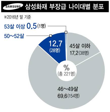 그러나 (1)과 (2)의 범주에 들고도 보직해임되지 않은 이들이 제법 있지 않은가. 이들은 “베테랑을 한꺼번에 들어내면 일이 안 돌아가니까 두어 차례 나눠서 하는 것”이라며 “이번이 아니면 내년, 길어야 내후년”이라고 했다. 회사 쪽 자료를 봐도 지난해 말 53살 이상 부장은 1명(0.5%), 2015년 말은 2명(0.9%)뿐이었다. 2014년 말엔 단 한 명도 없었다.