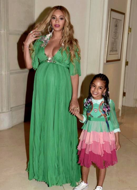 임신 중인 비욘세는 만삭의 배를 그대로 그러낸 초록색 드레스를 입고 아름다움을 뽐냈다. 임신 중에도 아찔한 하이힐을 고수해 눈길을 끈다. 비욘세의 딸인 5세 블루 아이비는 엄마와 함께 초록색 드레스를 입고 나들이에 나섰다. 비욘세의 남편 제이지는 화려한 호랑이가 그려진 청재킷으로 캐주얼한 느낌을 연출했다.