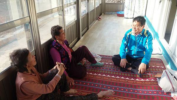 | ▲ 장사도에 사는 할머니들과 대화하는 목포대학교 도서문화연구원 이재언(오른쪽)씨 모습 |