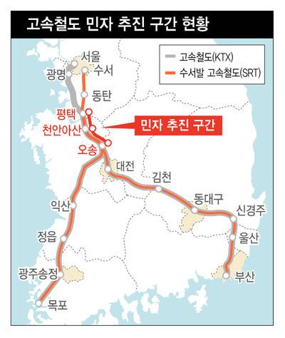 정부는 경부·호남고속철도가 모두 지나가는 알짜 노선인 ‘경기 평택~충북 오송’ 구간 고속철도 추가 건설과 운영을 민간에 맡기려고 하고 있다. 그동안 민자 사업은 수도권 광역철도에 집중됐는데, 고속철도 등 전국 철도망으로 확대되는 것은 처음이다. 이미 대형 건설사인 현대산업개발이 뛰어들었고, 지난해 6월부터 한국개발연구원(KDI)이 민자 사업으로 적합한지 평가를 하고 있다. 정부는 평택~오송 구간은 현재 복선 철도가 깔려 있는데, 수요가 계속 늘고 있어 추가 철도 건설이 필요하다는 생각이다. 지난해 12월 수서고속철도에 이어 2023년엔 인천·수원발 고속철도가 개통될 예정이다. 정부는 재정이 부족하다며 이 구간을 민자 사업으로 하겠다고 발표했다. 평택~오송을 시작으로 14개 신규 노선도 민간에 넘길 방침이다.
