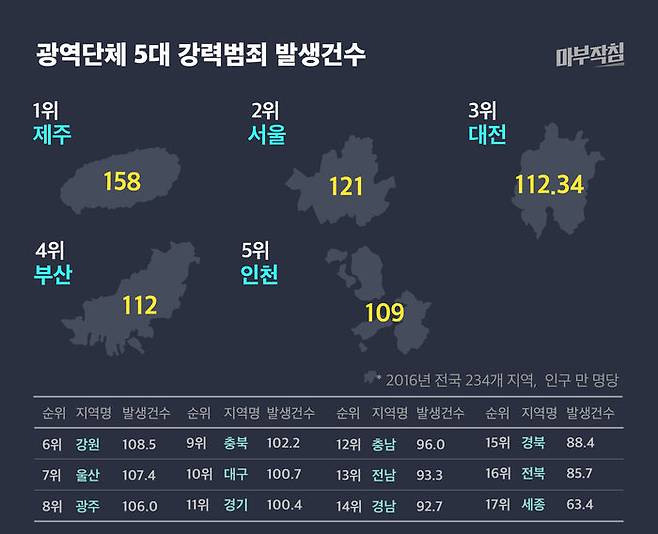 2016년 5대 강력범죄 발생 건수(1만명 당)가 가장 높은 지역은 제주자치도(158건)로 드러났다. 17위를 기록한 세종시(63건)보다 2.5배 가까이 많았다. 다음으로 서울(121건), 대전(112건)순이었다. 제주도는 2014년 (172건/만 명당)과 2015년 (163건/만 명당)도 범죄 발생이 가장 많아 3년 연속 광역단체 중 1위를 기록했다.